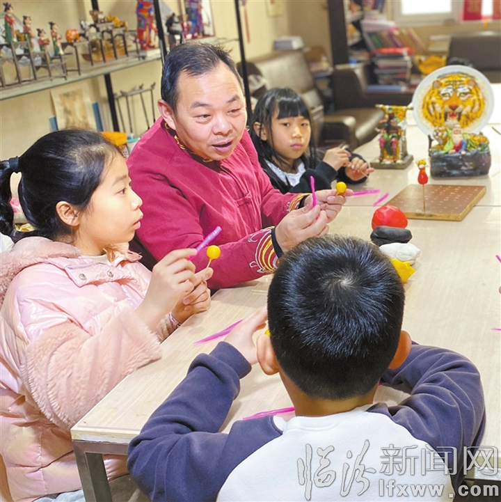 临汾新闻网讯 市级非物质文化遗产面雕传承人林建荣现场展示非遗项目,让孩子们充分感受传统工艺的独特魅力和文化内涵。图为林建荣正在教授学生制作面雕老虎。