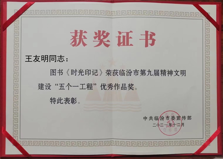 2021年12月24日,临汾市举行了以“永远跟党走”为主题的第九届精神文明建设“五个一工程”表彰展演活动,对63件优秀作品进行了表彰,王友明的散文集《时光印记》荣获优秀作品奖。日前,《神州文学》杂志社“年度优秀图书名单”新鲜出炉,他的散文集《时光印记》榜上有名。王友明为临汾文化事业焕发出新的活力,做出了积极的贡献!(孙鹏、王登博)