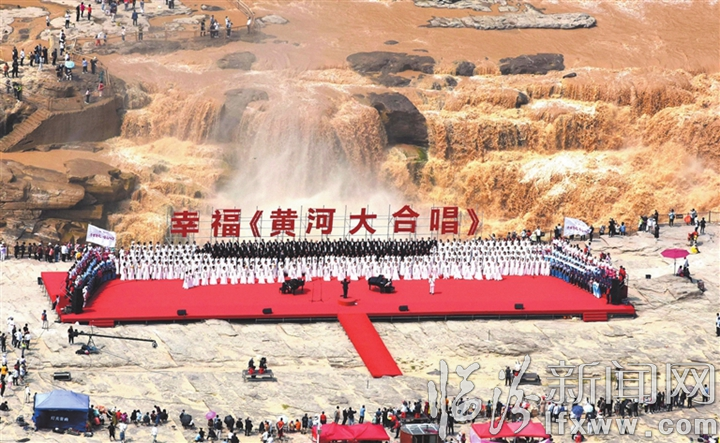 临汾新闻网讯 9月6日,来自广州幸福之声合唱团的千名群众来到吉县黄河壶口瀑布旅游区,合着黄河壶口瀑布咆哮的波涛声,共同唱响《黄河大合唱》,旨在以“千里奔赴·唱响山河”为主题“身临其境”感受革命歌曲的魅力,致敬人民音乐家冼星海。