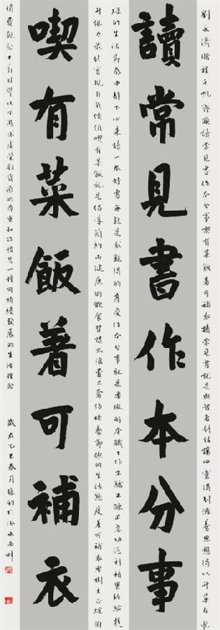 一直以来很喜欢梁启超先生“趣味”之说:我是一个主张趣味主义的人,我觉得万事万物都有趣味……凡人常常生活于趣味之中,生活才有价值。如何能有趣味?研究你所嗜好的学问。余秋雨先生有云:汉字是中国文化的第一存在,书法是中国审美的第一形态。六十多年的书法实践告诉我,书法就是有趣味的学问,更是有趣味的生活,故书法受众甚蕃。