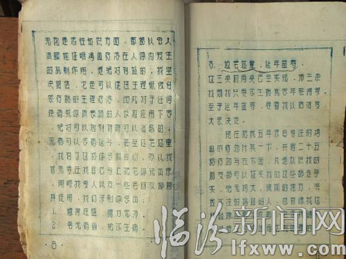 这本书为蜡纸刻印,字迹颜色为蓝色,共有50余个页面。梁师傅按照书原来的样子,在书的封面写上了《鸡血疗法》。这本书为废纸的背面刻印,文字的背面有“……工装生产计划进度表”等字样及表格。