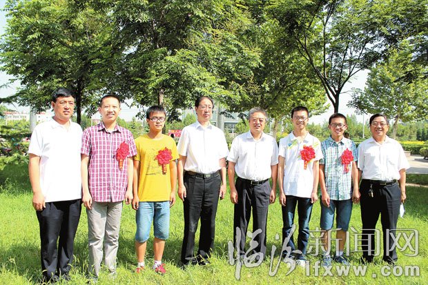 襄汾县委书记王国平(右四),县长张宏志(左四),副县长曹佩(左一),襄汾县教育局局长、襄汾中学校长刘彦青(右一)与考上清华、北大的4名学子合影留念