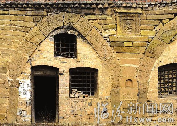 走进古寺发现,三层古寺为金字塔状,座南朝北,最上层有一孔窑洞,窑面是现代红砖砌筑,表明是近年才修缮的。一座钢制阶梯从一层直通三层。二层有5孔窑洞建筑,东侧两孔窑的弧形是用砖建造的,而西侧的两孔弧形则是用砂石岩材质,上面还雕刻着精美的图案,而最西边窑洞的弧形有一部分损毁,一块雕有花纹的砂岩平躺在窑洞前。