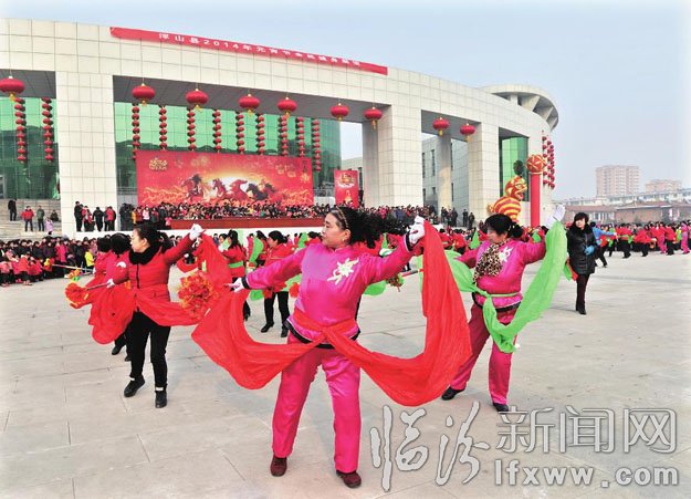 2月14日,浮山县在县文体广场举行2014年元宵节全民健身展示活动,浮山县300余名中老年人展示体育健身“秀”。此次全民健身展示活动是由县委宣传部主办、县文化体育广播电视新闻出版局承办、县老体协协办,来自城区5个健身站的300余名中老年人参加了体育健身项目的表演。