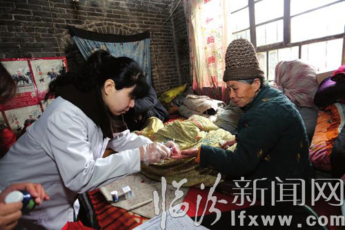 上午10时许,在村民张西凤的家中,行动不便的她一见到志愿者的到来,激动地握着我们的手,连连示意我们坐上炕头。在医生叮嘱她饮食方面需要注意的事项时,她频频点头,医生还对她提出的问题进行了解答;当记者表示会为她免费拍摄照片时,她更是不住地说着感谢的话。