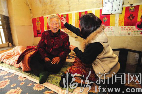 志愿者走进81岁的村民焦金枝家中时,因高血压正卧床的老人连忙坐起来,听到记者要给她免费拍照时,她高兴得合不拢嘴。记者帮她认真地梳理好头发,镜头前老人神采奕奕的笑脸感染了在场的所有人。