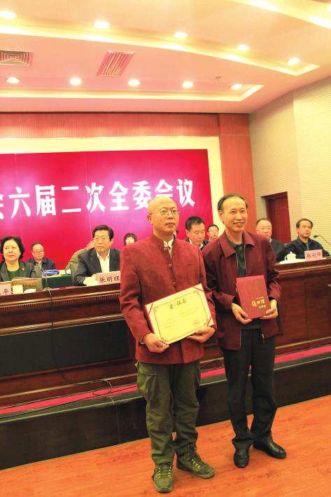 乔忠延(右)在“赵树理文学奖”散文奖领奖台上