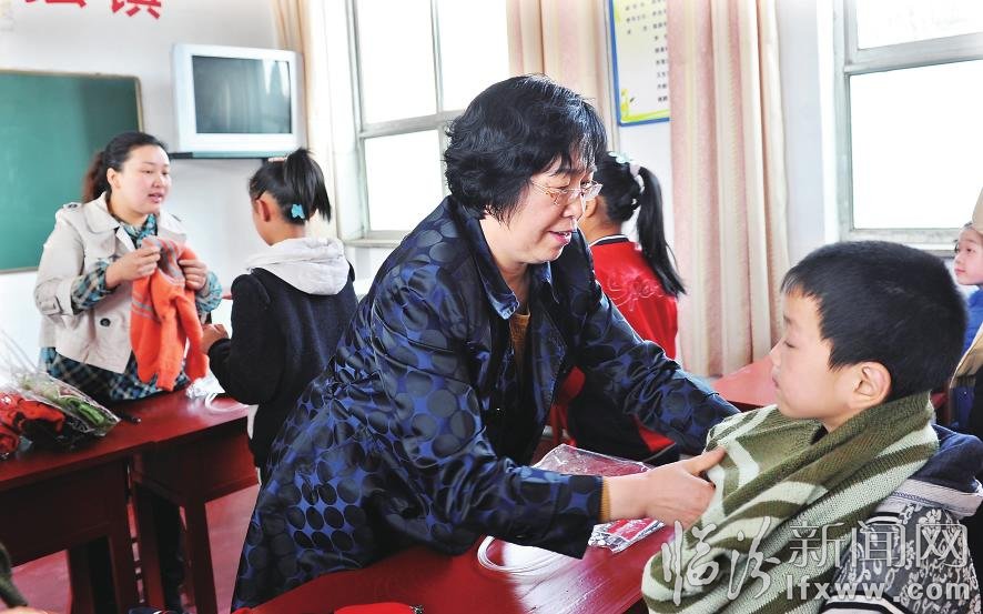 3月26日,尧都区妇联的工作人员为孤儿黄诗怡穿上春款“爱心毛衣”。当日,尧都区妇联“情系春蕾,恒爱同行”爱心捐助活动在尧都区乔李中学举行,为10名贫困儿童送去了救助金和爱心毛衣,同时为他们进行了心理辅导,把更多的关爱送给这些困难儿童,使其在阳光下快乐成长。
