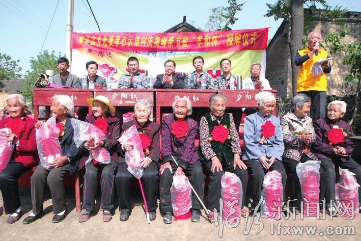 9时整,在热烈的礼炮和欢快的锣鼓声中,母亲节颁奖典礼开始了。首先是县、乡、村里的领导给全村高寿的老母亲们戴上大红花,颁发纪念品。接着,全体人员向中华民族共同的母亲——孟母和这些高寿母亲鞠躬行礼。这些母亲中年龄最大的92岁,最小的80岁。她们穿着村里赠送的黄马甲,上面写着“种德收福”,脸上笑成了一朵朵金色的雏菊。全场掌声雷动。