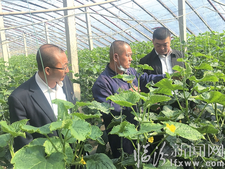 临汾新闻网讯 为助力春耕工作,翼城联社对辖区农户进行摸排,图为工作人员在黄瓜种植户石小闹的大棚里实地查看其经营情况。