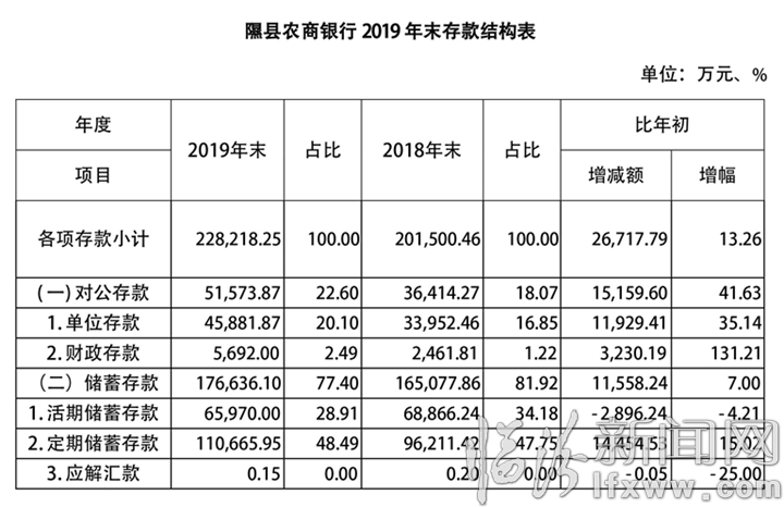 在负债中,年末各项存款余额228,218.25万元,较年初增加26,717.79万元,增幅13.26%。对公存款余额51,573.87万元,较年初增加15,159.60万元,增幅41.63%,其中:单位存款余额45,881.87万元,较年初增加11,929.41万元,增幅35.14%;财政性存款余额5,692万元,较年初增幅3,230.19万元,增幅131.21%;储蓄存款余额176,636.10万元,较年初增加11,558.24万元,增幅7%。