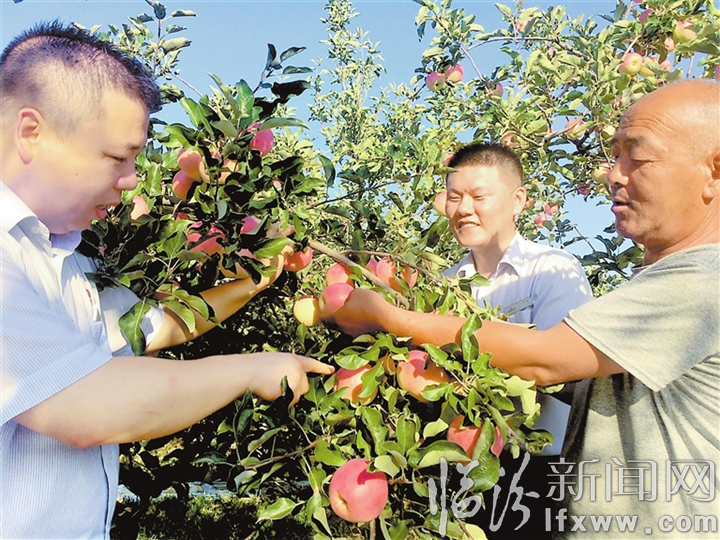 临汾新闻网讯 又到一年苹果丰收季,吉县农商银行在苹果产业“种植—贮藏—销售”产业链的各个环节,与果农、果商紧密合作,倾力支持。图为工作人员在果园里了解苹果生产、销售情况。