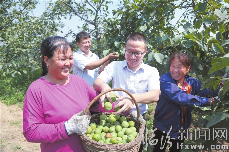 临汾新闻网讯 正值核桃丰收季,洪洞农商行组织“红马甲”志愿服务队深入山目乡曹家沟村核桃种植园,一起摘收核桃。劳动中,他们帮大家解决使用金融产品过程中遇到的问题,并宣传相关金融政策。图为志愿者帮村民采摘核桃。