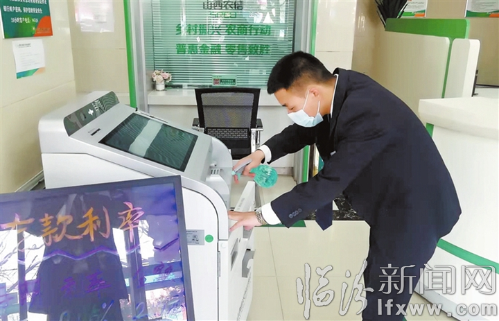 临汾新闻网讯 洪洞农商行把“党员先锋”作为助力疫情防控的重要力量,引导广大党员干部主动亮身份、敢于挑担子、带头作表率,筑牢疫情防控的“铜墙铁壁”,为客户提供优质的金融服务。图为党员员工对自助机具进行消毒,切实保障广大客户和员工身体健康。