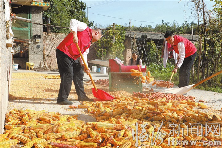 临汾新闻网讯 秋收时节,浮山农商行红马甲志愿者深入佐村空巢老人家中开展“助农在行动 农商送秋意”专项帮扶活动,帮助老人完成玉米脱粒、晾晒工作,赢得了群众的交口称赞。图为志愿者在义务劳动。