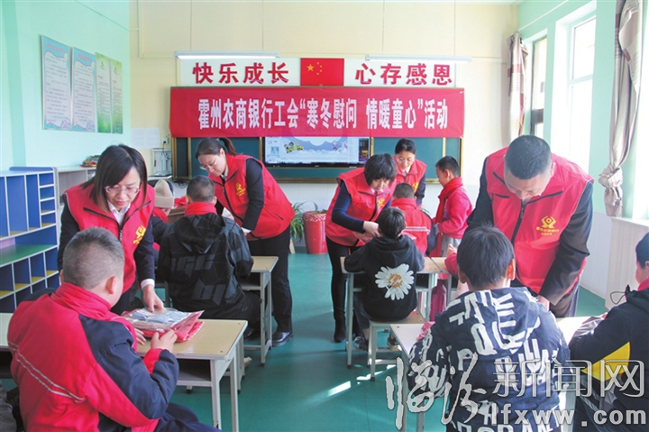 临汾新闻网讯 为切实关心关爱特殊儿童健康成长,近日,霍州农商行工会志愿者走进霍州市特殊教育学校开展“寒冬慰问 情暖童心”活动,向孩子们送上了手套、帽子、围脖等御寒物品,也为孩子们送来农商行的关爱和祝福。图为慰问现场。
