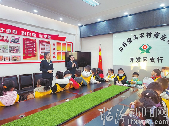 临汾新闻网讯 为普及金融知识,侯马农商行开发区支行近日联合幼儿园开展了以“欢乐童年 商行伴我成长”为主题的活动,引导幼儿参观银行工作区域,并向幼儿讲解银行制度、工作流程、注意事项和有关的银行知识,取得了学用相长的良好效果。图为工作人员向幼儿讲解银行知识。