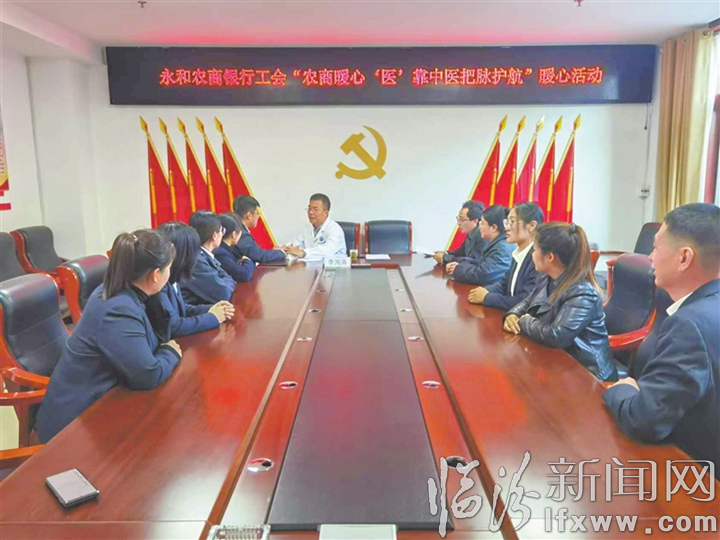 临汾新闻网讯 永和农商银行工会近日邀请永和县医院中医专家,通过望、闻、问、切等传统诊断方法,了解员工们的身体状况,针对员工不同的体质和症状,提出个性化养生建议和注意事项。图为中医专家为员工诊断现场。