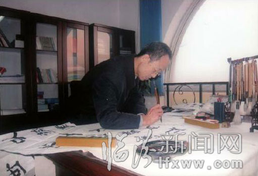 我对郭正亮先生书艺成功之路的探寻思考,想以“痴”、“勤”、“思”、“容”四个字来概括。“痴”者,乃他对书法的痴情酷爱。我觉得,这大概是他成功的内核所在。孔子云:“知之者不如好之者,好之者不如乐之者。”入迷才能入门,入门方能登坛。只有像他那样痴迷翰墨,才有奋笔疾书的内在动力,才有以苦为乐的不懈追求,才有工作之余的艺海拾贝,才有日积月累的艺术积淀。在他刚满5岁还没有走进学校大门之前,就依照父亲的嘱咐开始认字和练习毛笔字,在幼小的心灵上,与笔墨结下了不解之缘。“勤”者,乃在郭正亮探求书艺、驰骋书坛的道路上,布满了令常人难以想象的艰辛。天才出于勤奋,丰收源自耕耘,枝繁叶茂的书艺之花赖于辛勤汗水的浇灌,在成功的路上没有任何捷径可走,除了勤奋,还是勤奋;除了耕耘,还是耕耘。郭正亮做到了,他没有茶余聊天的余暇,他没有牌局消遣的嗜好,有的则是下班归来的砚田练笔,有的则是节日假日的墨海遨游。