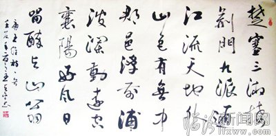 “三气”足以显现他的书外功夫。字外之功,诗意为上。大凡好的艺术家,都有好读书的习惯。天平自幼喜欢语文,1985年考取地委党校时,语文成绩名列前茅。平时好读杂类书,不论在部队还是在地方,无论是在机关上班,还是外出开会,手头总离不了诗书,《李白诗选》《王维诗选》《苏轼诗选》《辛稼轩词选》等这些人的诗句在吟咏之间,时时激发他书法创作的灵感。2012年8月1日建军节到来之际,他想起42年前驻守长江边的火热生活和战友深情,挥笔写就“军旗烈,魂系五星情真切,情真切,银鹰飞舞,雷达映月。万里长江东逝水,千丈磁波遨天界,遨天界,青丝易老,剑胆难却!”并发给同期战友,许多战友欣喜地和诗,并挂在网页上。