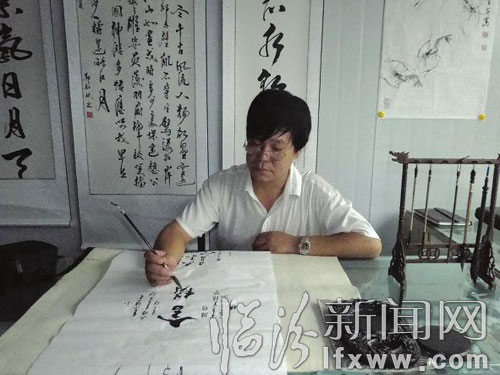 循着缕缕墨香,记者在凌云斋内见到了正伏案泼墨挥毫的邓红斌,他的身旁平铺着一幅幅得意之作,提到书法艺术,他打开了话匣子。