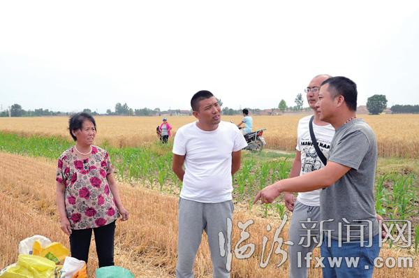 麦收时节,田强(左二)正在田间地头了解小麦收割情况。记者 柴云祥 摄