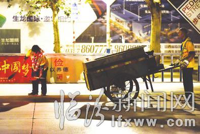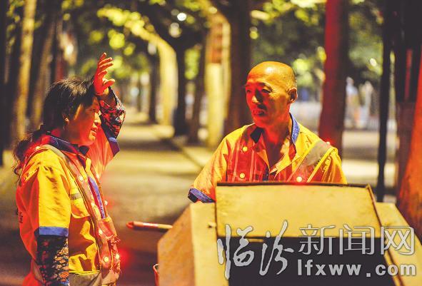 凌晨两点人们还在熟睡,解放路上偶尔有几辆出租车和工程搅拌车穿城而过。丈夫张洪顺由解放路平阳广场向水厂方向清扫,妻子安顺花则反方向开始清扫。完工时,两人将垃圾回收车上满满一箱的垃圾送到解放路清运点,便回家吃早饭。6点左右,夫妻二人又骑着电动车完成接下来的清扫工作,直至中午12时30分。