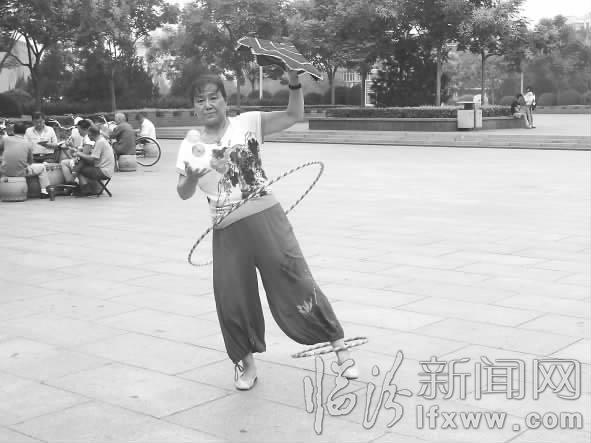 邱付霞家住贡院街,今年60岁,是临北煤焦发运站的退休职工,退休后她一直在家照顾老人,去年7月开始,她在照顾老人之余就转转呼啦圈,既锻炼了身体又照顾了老人,邱付霞说:我琢磨着转呼啦圈只是腰在动,就想着往手里加点东西,就在手中加了一个手绢,后来觉得只有手绢比较单一,又加了三颗弹力接抛球,大家都说我是一心三用,但我认为这些动作主要是要协调好自身各部位的能力。”后来家里的老人过世了,邱付霞才开始全身心地投入到自编的炫舞串操中,今年过完年便开始坚持每天锻炼,我的这段炫舞串操现在难度又增加了,不止往脚上加了个小呼啦圈,还加了跳绳,总共手脚腰有五项动作,我让呼啦圈‘跳起来’了。”邱付霞说,她要挑战自己的极限,也希望可以尽情展现自己的才艺。