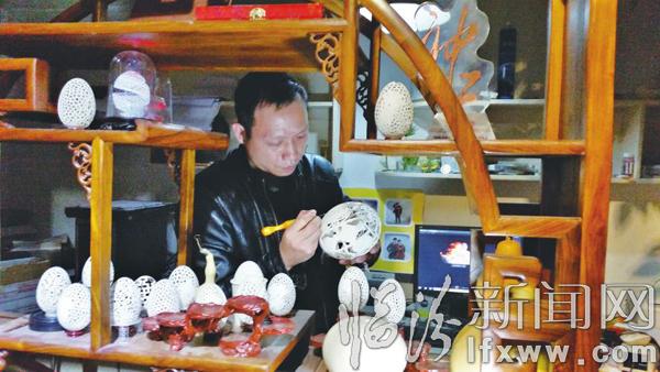 与蛋雕结下不解的缘分,缘于一次在网上看到有人在鸡蛋上雕刻,孔斌感到十分稀罕,就在网上淘来了雕刻工具,自学蛋雕技艺。鸡蛋个小皮薄,个大且皮稍厚一些的鸭蛋、鹅蛋较好,约为0.3毫米,其实最好的还是鸵鸟蛋,约有2毫米厚,不过一只就上百元,成本太大。”孔斌告诉记者,起初学习用的是鸡蛋,仅0.2毫米的鸡蛋壳能练出手艺,现在他用的多数是鸭蛋、鹅蛋。
