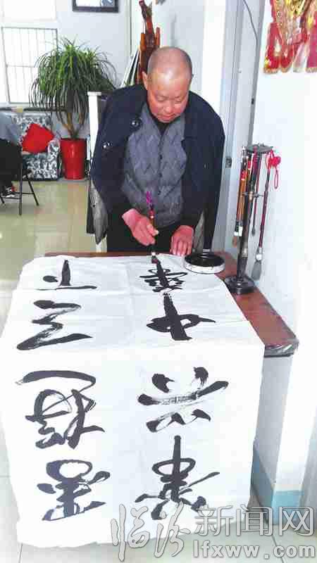 临汾新闻网讯 今年82岁的陈有亮是大宁县的一位退休老干部。他自幼酷爱写字,痴迷书法,是临汾市老年书法家协会会员、大宁县老年书法家协会会员。他经常参加一些书法公益活动,逢年过节,他总是帮邻里、朋友们书写对联,他的书法作品曾参加临汾地区书法展西山五县巡回展等活动;他还经常义务参加县上组织的送春联下乡。陈有亮高兴地说:我这一生就这一个爱好——书法。”自1991年退休后,二十年多来,他每天和纸墨笔砚相伴,每日练习书法让他的晚年生活也变得充实有趣。 (冯振兴)