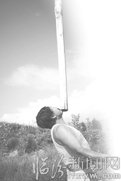 原林林的第一关是顶木桩。4米长的木桩,在他的股掌中“十分听话”。木桩稳稳地立在他的手掌、拳头、手臂、大拇指、下腭上。他顺利地闯过了第一关。