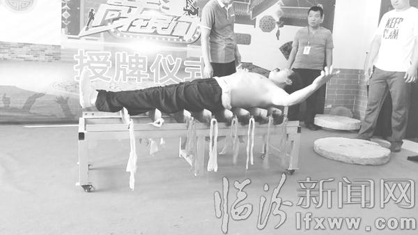 第二关睡铡刀,原林林躺在八片锋利的铡刀上,两位助手将上百斤重的石磨盘压在其身上。第二关也轻松闯过。8月10日,记者采访原林林时在他家中看到了闯关时用的铡刀床,用手试了试,刀刃非常锋利。