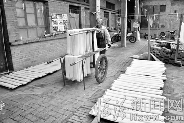 临汾新闻网讯 今年64岁的“老粉匠”贾明星是霍州市大张镇小西张村人,从父亲手中传承了粮食粉条制作手艺。他每天生产粉条450余公斤,收入5万元左右。如今,贾明星一家靠着这门手艺生活殷实幸福。图为贾明星正在晾晒刚制作出来的精制粮食粉条。