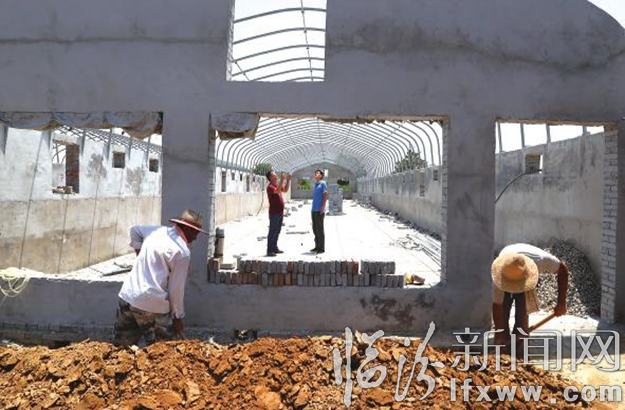 宋海龙同村党支部书记卫传翔查看生猪养殖基地建设情况。该基地的建成,将为更多贫困户解决就业难题,增加村民收入。