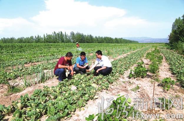 宋海龙与尧头村“第一书记”段小静、村党支部书记卫传翔商讨发展桃树产业,计划连片发展,形成当地优势产业。图为他们查看桃树间种药材的情况。