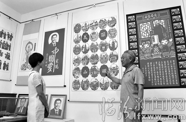 时代在发展,剪纸也要顺应时代的要求。许多人并不知道,郑洪峨是“童话大王”郑渊洁的亲叔叔。前些年,受侄子的启发,他拓展剪纸发展空间,专研人物肖像剪纸。时至今日,已制作了包括爱因斯坦、乔布斯等150多位国内外现当代名人的剪纸肖像。他还在徒弟的帮助下开通了“郑洪峨剪纸人物肖像”的淘宝店,为网友订制个性肖像剪纸,深受喜爱者追捧。仔细观赏这些形神兼具、画面灵动、技法细腻的作品,让人不禁大呼“像!像!真像!”郑洪峨就是这样一个为艺术上下求索而又孜孜不倦的人。8月24日,他的三幅作品——《美丽山西》,以及携长孙盼盼创作的大型剪纸《贾存仁与弟子规》和《弟子规》入展山西省第三届文博会,一时引来观众围观点赞。