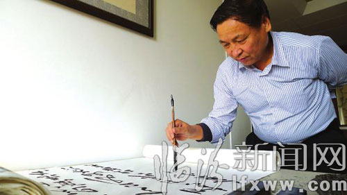 张俊山告诉记者,当时听说王斌是全国著名横反书法家,正在临汾参加一个活动,便前往想拜他为师,但是却吃了闭门羹。后来他把自己的作品托人带给王斌老师。“没想到他看了以后就接待了我,还让我现场写一幅横反书法作品。”张俊山说,由于先前吃了闭门羹,他想象王老师一定是盛气凌人,让人敬而远之,没想到王老师慈眉善目、平和谦逊、亲切感人。他表达了拜师的意愿,但王老师却不答应,而是说可以共同学习、交流横反书法。在场的师母说:反着写字本身就不容易,何况俊山还写得这么好,你不收我收。”最后,师傅拗不过师母便收张俊山为徒。