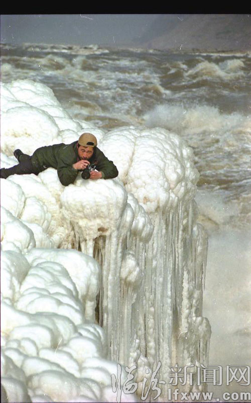 吕桂明正卧在冰层上拍摄壶口雄姿。