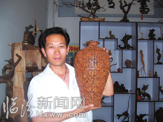 已过不惑之年的刘国平不再是“瞎折腾”,他的努力付出正赶上了政策的“东风”。今年年初,隰县县委、县政府研究制定了《隰县文化产业发展规划》,明确提出要挖掘民间艺术资源,推动民间工艺品加工。县委宣传部副部长梁云云说:“今年,我们成立了隰县民间工艺品研发中心,积极组织引导开展民间工艺品研究、生产、营销等工作。目前,这个中心已投资30余万元,建立了两个生产车间,招聘生产工人20余人,主要产品有根雕、山核桃工艺品、旋木工艺品等,这些工艺品具有浓郁的地方特色和很高的艺术价值,多次获得省、市博览会奖项,今年,又被选为上海世博会、全国绿化博览会和全国民间艺术展览会参展作品。这次上海世博会上有45件产品参展,目前,反响很好,已初步签订两份订单。我们还将继续加大民间艺术的开发推广力度,形成以隰县民间工艺品研发中心为龙头,带动全县根雕、旋木、剪纸、刺绣等工艺品产业的发展。