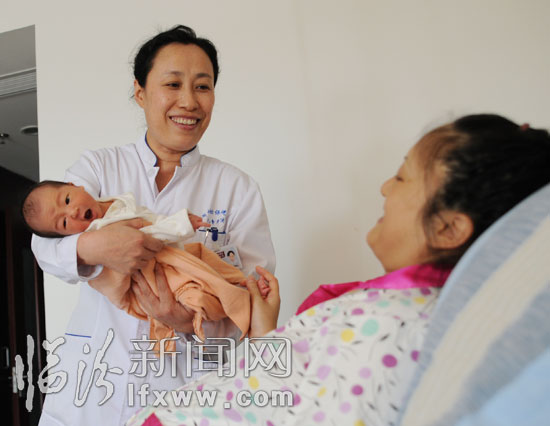 卫雪梅大夫在病房向产妇传输育婴知识。李虎威 摄
