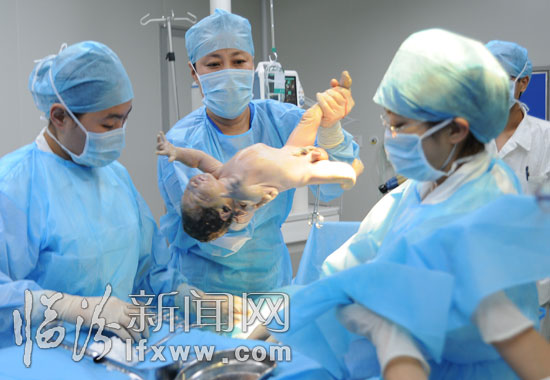 卫雪梅大夫(中)为一个剖腹产孕妇做手术,正把婴儿从母亲的腹中取出。李虎威 摄