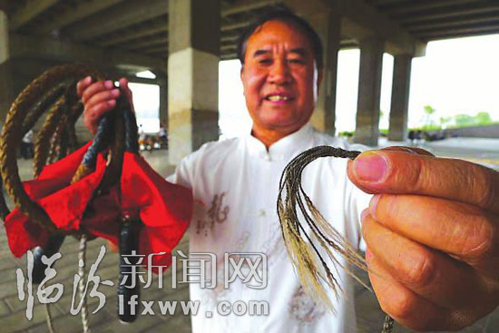 “表演的那天,我们的节目排到了第19位。”队员王新民说,“我们中间除了贾万聪老师参加过此类的大型节目外,剩下的都是新手,一到台上就紧张得不行,全身冒汗,最后还好,我的双手单鞭顺利演下来了,引起了雷鸣般的喝彩声,黄正东的单手双边、焦金生的双手舞鞭也都效果不错。”“真是台上一分钟,台下十年功,当贾万聪老师的鞭技一亮相,立刻全场轰动,掌声、呐喊声、叫好声连成一片,全场为之沸腾。”王新民说,“尤其是鞭打鲜花,我嘴里叼着一枝鲜花,一声鞭响过后,枝留花落,离嘴边只有一公分多,非常惊险。”此次,平阳神鞭表演一举摘取了第六届台湾世界中老年“金百合花奖”合唱、舞蹈、服饰风采大赛的最高奖和最高组织奖。(记者 郝海军 苏亚兵)