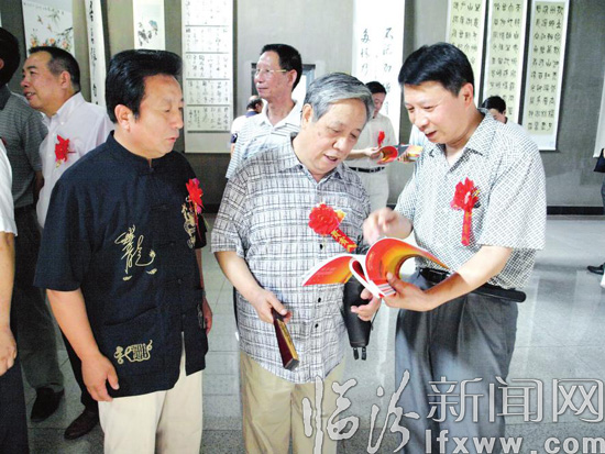 在市诗书画院举行的庆祝建党90周年诗书画大赛展览期间,马温才向书法名家介绍大赛相关情况。王小庚 摄