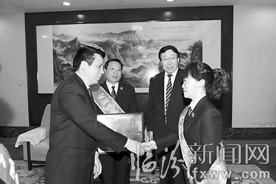 在获得“全国模范法官”荣誉称号后,省委常委、政法委书记王建明同志亲切接见白婕。