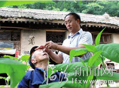 老人眼睛手术成功后,韩洪喜在康复期帮他滴眼药水消毒、护理。