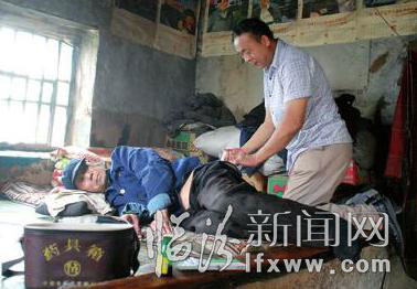 今年56岁的韩洪喜大夫四世同堂,上有老母,下有四个子女和孙子,上孝敬老人,下严管孩子。照顾冯元堂的事,孩子们看在眼里,大儿子韩涛学校毕业后一直跟父亲在诊所里工作,只要有时间,也加入了照顾冯元堂老人的行列。有些认识韩洪喜的人对他照顾冯元堂的事情不解地说:“一个外村人吃多了,自己给自己找麻烦,多管闲事……”而韩洪喜却笑着说:“也没有啥事,行行好,人老了,总得有人帮把手。”(记者 李自强 摄影报道)