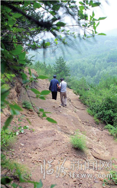 在崎岖的山路上,韩洪喜陪老人往返在山路上。