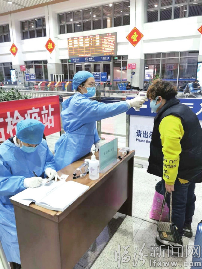 图为洪洞县医疗集团人民医院的医护人员在洪洞西站为旅客测量体温。 (樊婷 毕振虹)