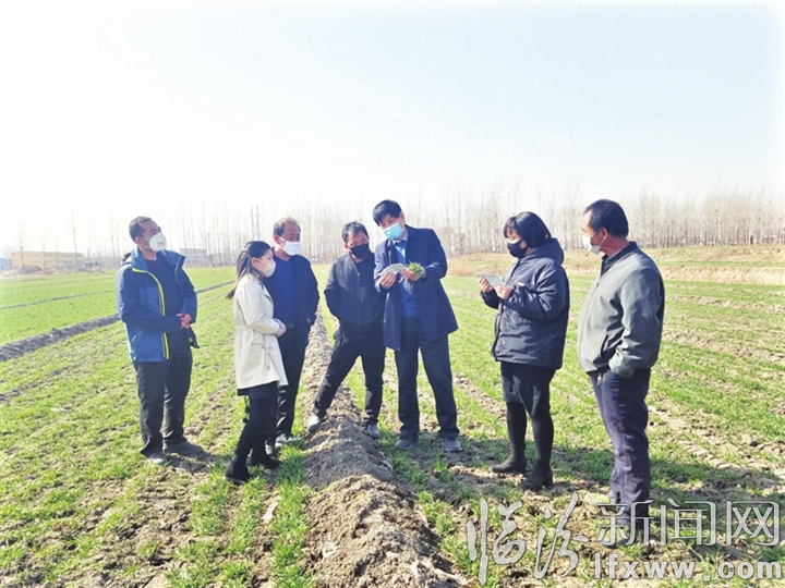 “槐乡英才”拔尖人才、洪洞县农业农村局总农艺师王小泰在赵城镇瓦窑头村沃园种植合作麦田查看小麦苗情。 (杨楠楠)