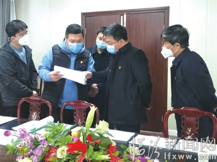 第八帮扶组向宏源二公司法人代表通报该企业疫情防控存在问题并签订整改责任书。